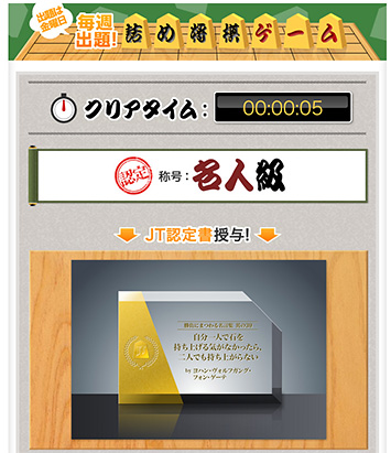 JT杯サイトの詰将棋、いつも焦ってただいたずらに時間を使い、結果6級くらいしか認定書しかもらえなかったのに、プレゼントが届いた日に挑戦したら、なんと名人級の認定書がもらえましたぞ。