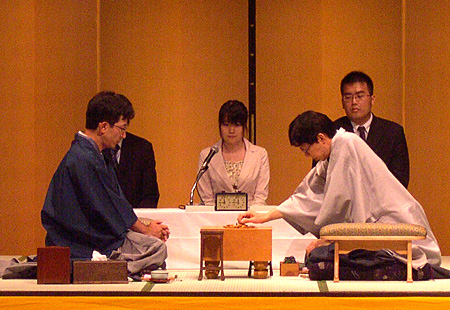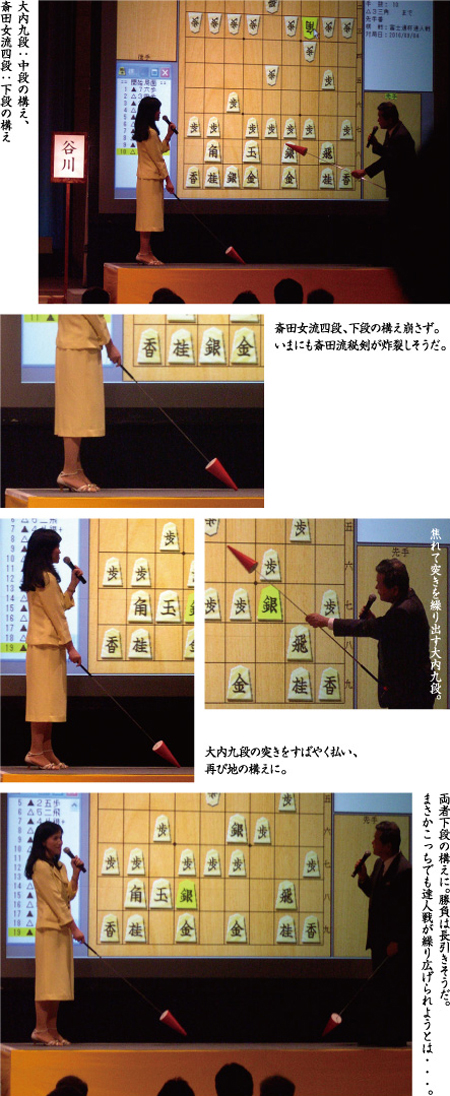 お客さんにも緊張感が伝わるのか、場内には厳粛な空気が流れている感じ。 と思いきや、その厳かな空気をかき乱すふざけた代物登場! 解説者と聞き手が手にしてる、あのデカイ槍はなんですか? これから合戦でも? ゞ(≧ε≦o)ぷぷっ!! ダメだ。あの槍が目に入るとつい吹き出してしまうゾ。