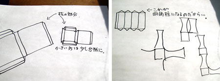 まずは板の部分。大きいのと小さいのを重ねるのだから、ひとまとまりにはできない(できるのかもしれないけど、将棋猫の頭脳がはじき出した答えは“ムリ!”)。この展開図なら猫でも思いつきます。簡単です。台座の部分は上部の板よりキモチ小さめに。サクサク進みます。簡単です。仕上げは板と板をつなぐ脚パーツです。基本は四角柱。ゆるくカーブがかかっているところはへこませてっと・・・あれ? あれあれ? どうやってつなげたらいいか解らーん!!ガガ━━Σ(゚Д゚;)━━ン!